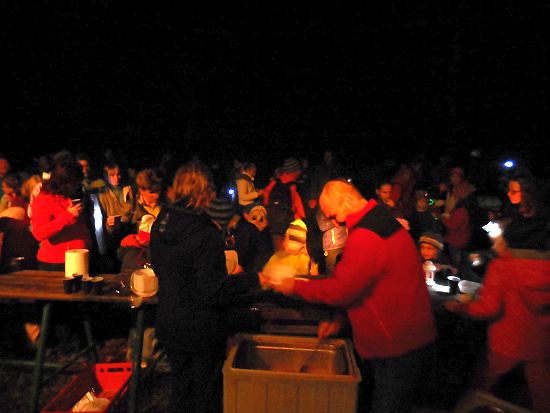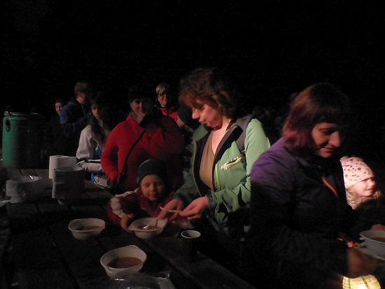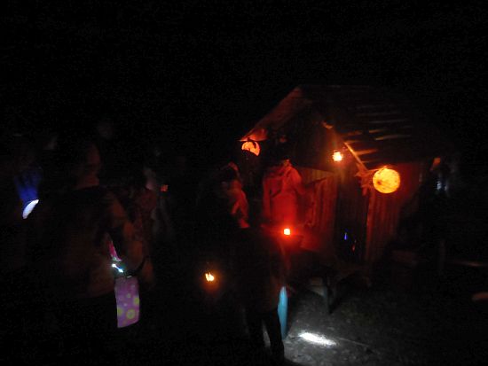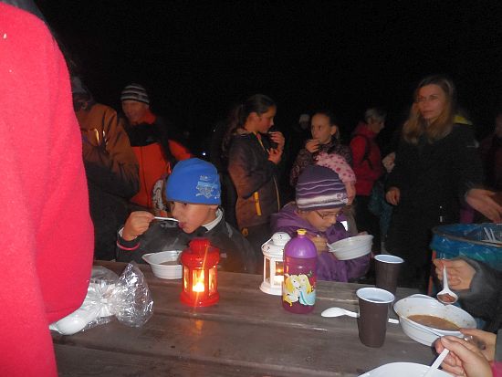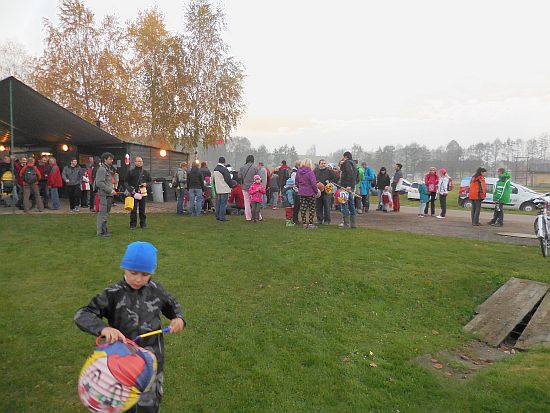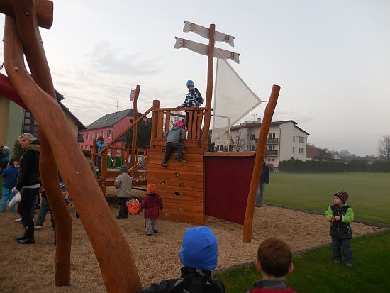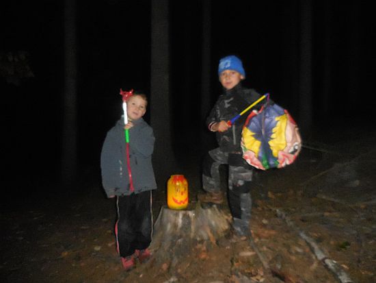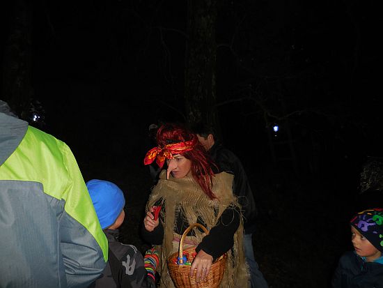Ze hřiště vycházel pochod ještě za světla. Zapadající slunce nad Lanškrounem hladilo dlouhou stonožku světýlek na cestě. U potoka čekali na děti vodníci a divoženky, na kraji lesa čarodějnice. Kdo se nebál a pokračoval v cestě, dostal zlaťák u loupežníků a taky buřtgulášek a čaj (pro rodiče byl svařák). Pohádkový dědeček nabízel v chaloupce sušené křížaly. A čerti s kosťákem v pekle to pak spočítali zlobivým rošťákům a trochu je popohnali vidlemi....